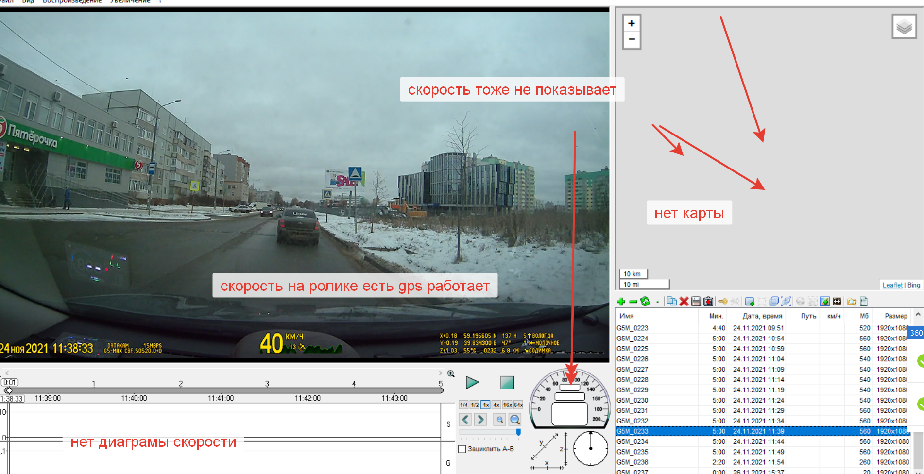 Добрый день уважаемые,года три не был на форуме,а сейчас появился вопрос,листать все,сил нет,может ответ и есть,а вопрос про датакам плеер.Обратил недавно внимание,что в плеере не отображается карта и диаграмма скорости, и спидометор не показывают скорость,хотя на самом ролике скорость показывает.Регистратор g5.В правом верхнем углу плеера все карты перепробовал,нет карты,в чем может быть дело?