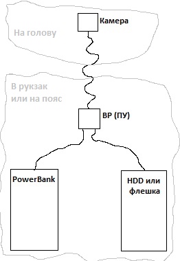 - Чтобы была возможность: память, питание и пульта управления размещать в кармане рюкзака или на поясе, а на голове держать только одну камеру.